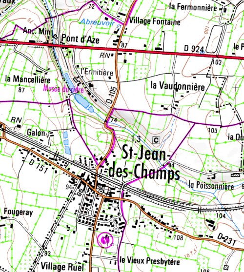 , au Sud de l'axe Villedieu-Granville. Bourg rural tranquille à l'écart des grandes voies. L'église du XIXème cache son cimetière. On remarquera dans celui-ci l'ancien calvaire de granit, au christ frustre mais évocateur comme dans nombre de calvaires ruraux. Mais plus encore nous semble intéressante, la petite croix, visible à l'entrée du presbytère, dite